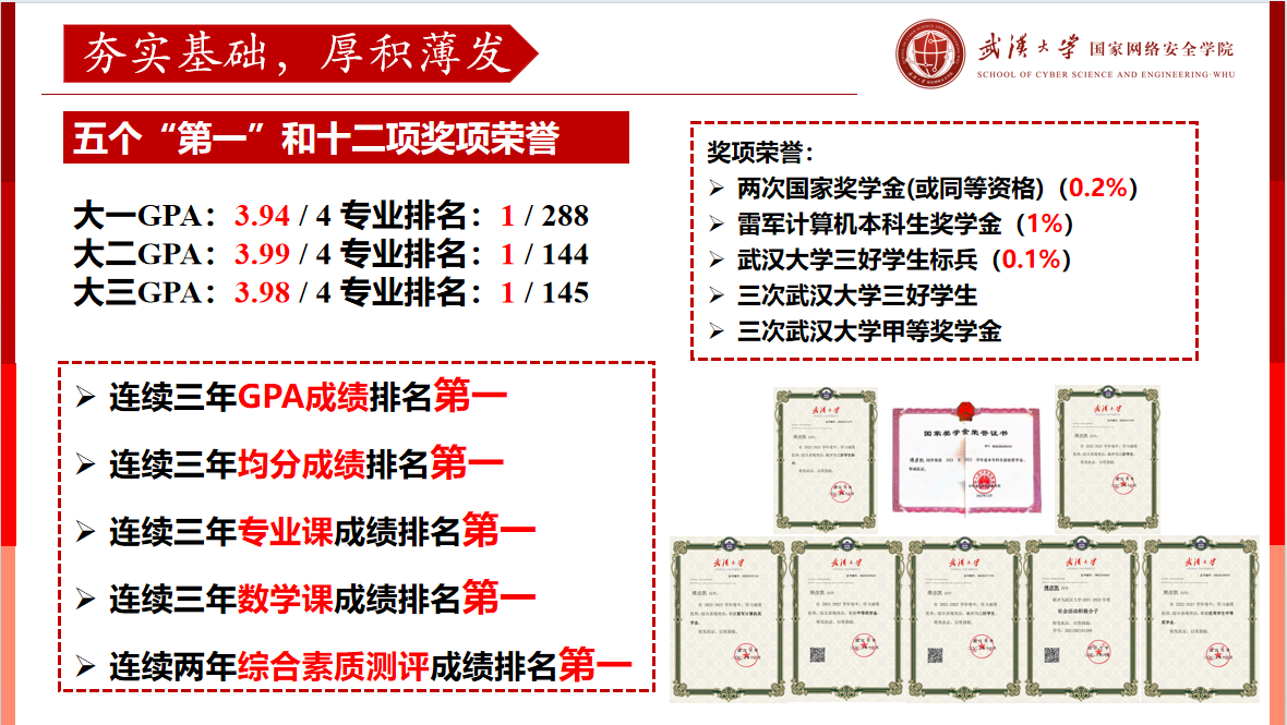 成绩斐然,学业GPA成绩3.97,连续三年成绩排名专业第一,国家奖学金、优秀学生甲等奖学金,雷军计算机本科生奖学金,以及 pornhub