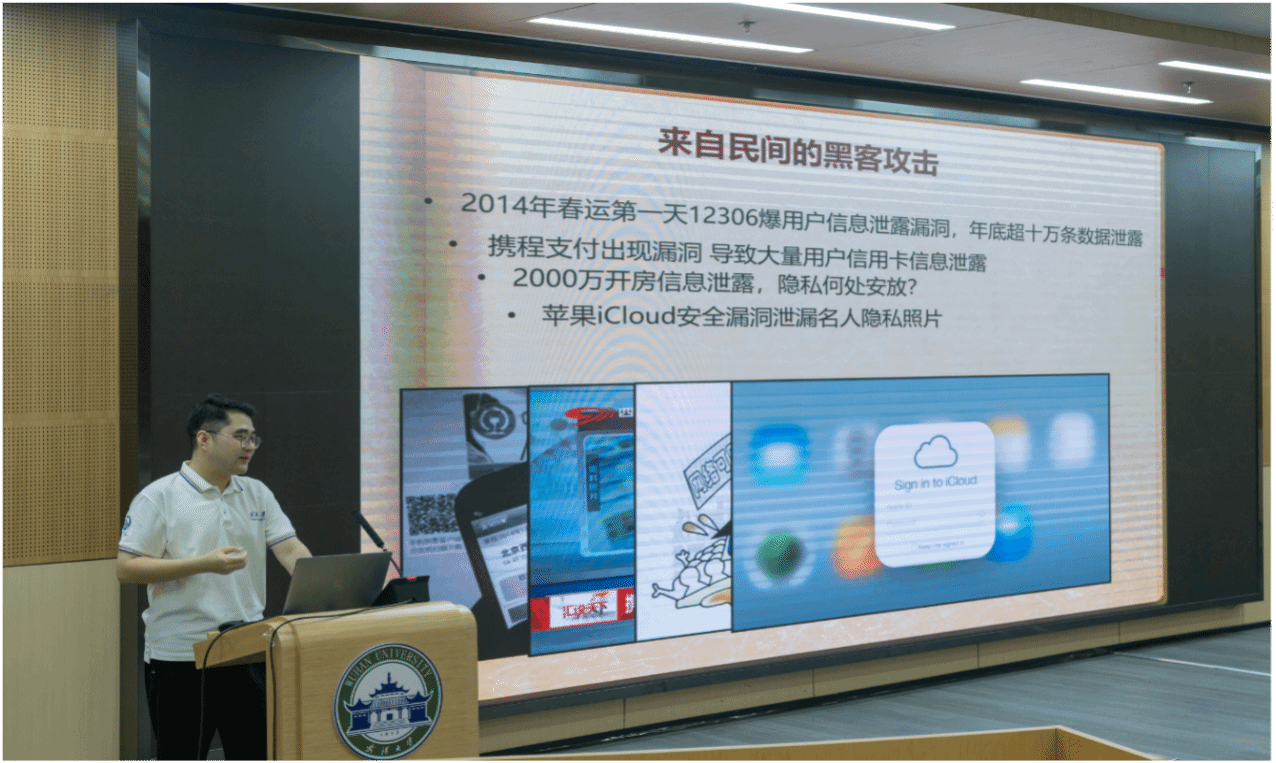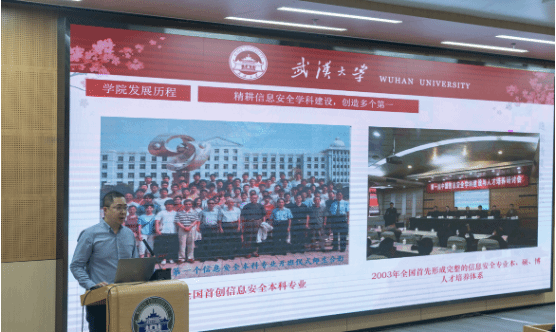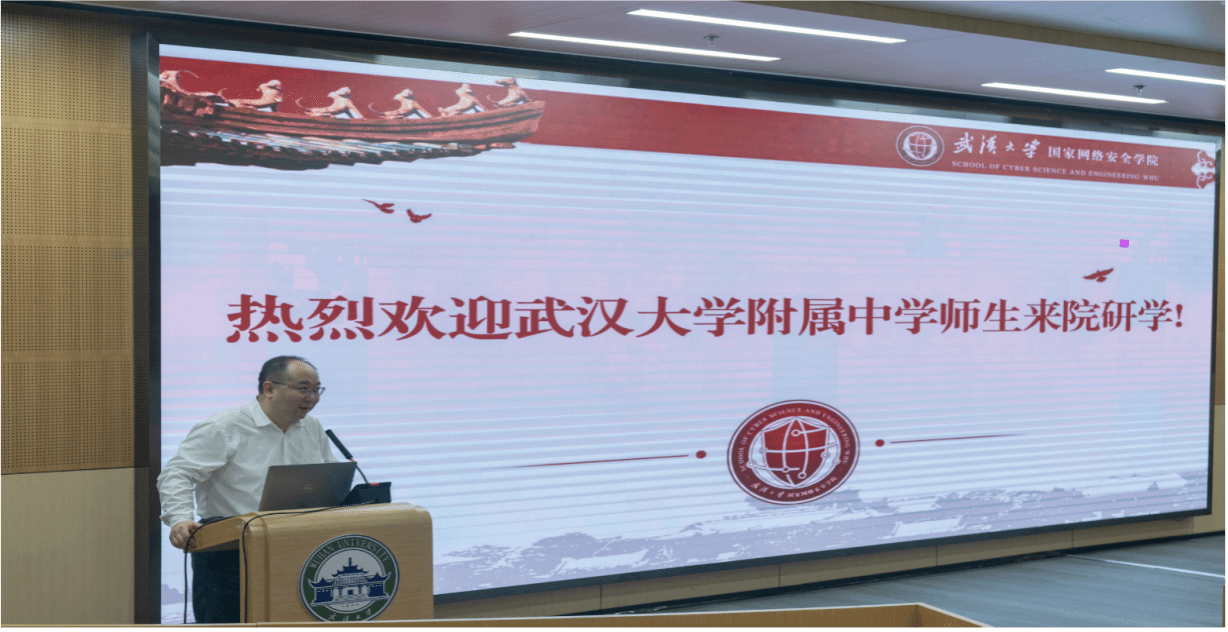 的宣传片。最后,学院博士研究生刘洋为武大附中的师生们做了题为《揭开密码学的神秘面纱》的网络安全知识宣传专业讲座。30分钟的讲座,让同学们了解了密码的特色内涵、实际应用、发展趋势、前沿科技等,深刻认识了保护网络安全对于维护国家安全的重要性。