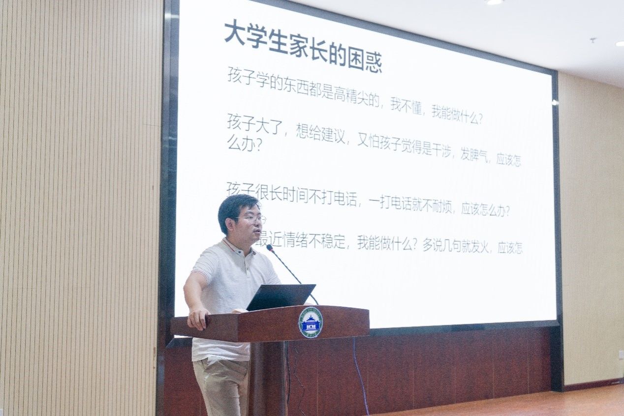 大学生心理健康教育中心副主任马鑫以“家校协力共助成长”为主题,为大学生心理问题的解决提供专业指导。他从当下大学生存在的众多心理、情绪问题着手,分析其表现形式、产生原因及解决方法,帮助家长探索与学生间的相处之道,希望能够帮助家长更好认识孩子的心理问题,发挥好家校协同育人在学校心理教育中的作用。
