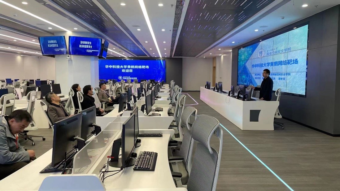 随后,彭正明一行在中心负责人李升辉、高鹏毅带领下,饶有兴致地参观了明德楼教学实验室、科研展示区、数据中心和教学中心机房,在黄鹤靶场系统听取了靶场建设、运行和教学情况的介绍。