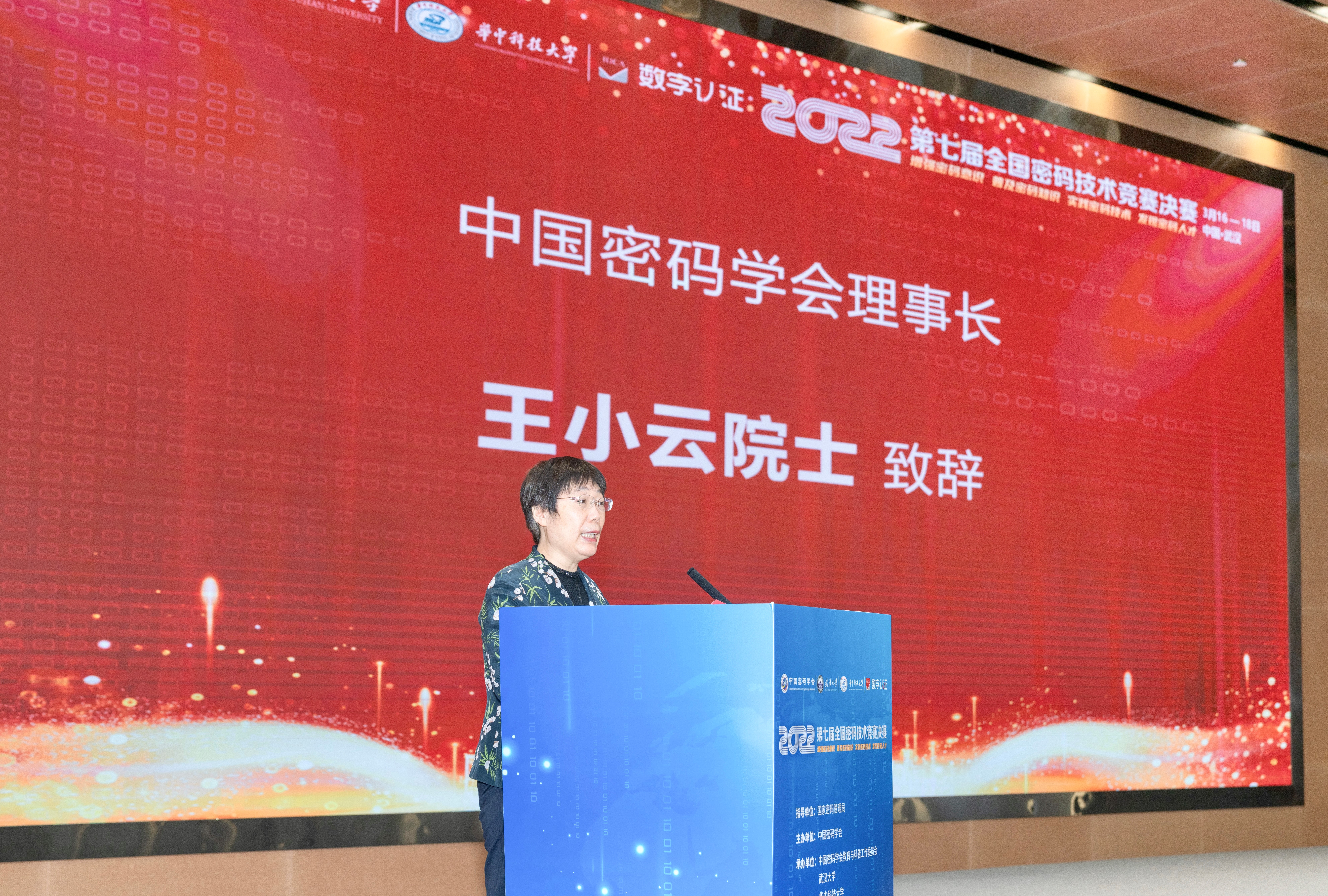 中国密码学会理事长、中国科学院院士王小云讲话。她指出,必须要牢记密码为国家服务的原则,重视基础研究的重要价值,切实将密码技术应用到国家和社会的重大需求中。王小云院士鼓励年轻老师和学子们:“你们处在历史上的最好时期,你们一定要勇于成为科技创新的‘排头兵’,不负青春,不负韶华!”