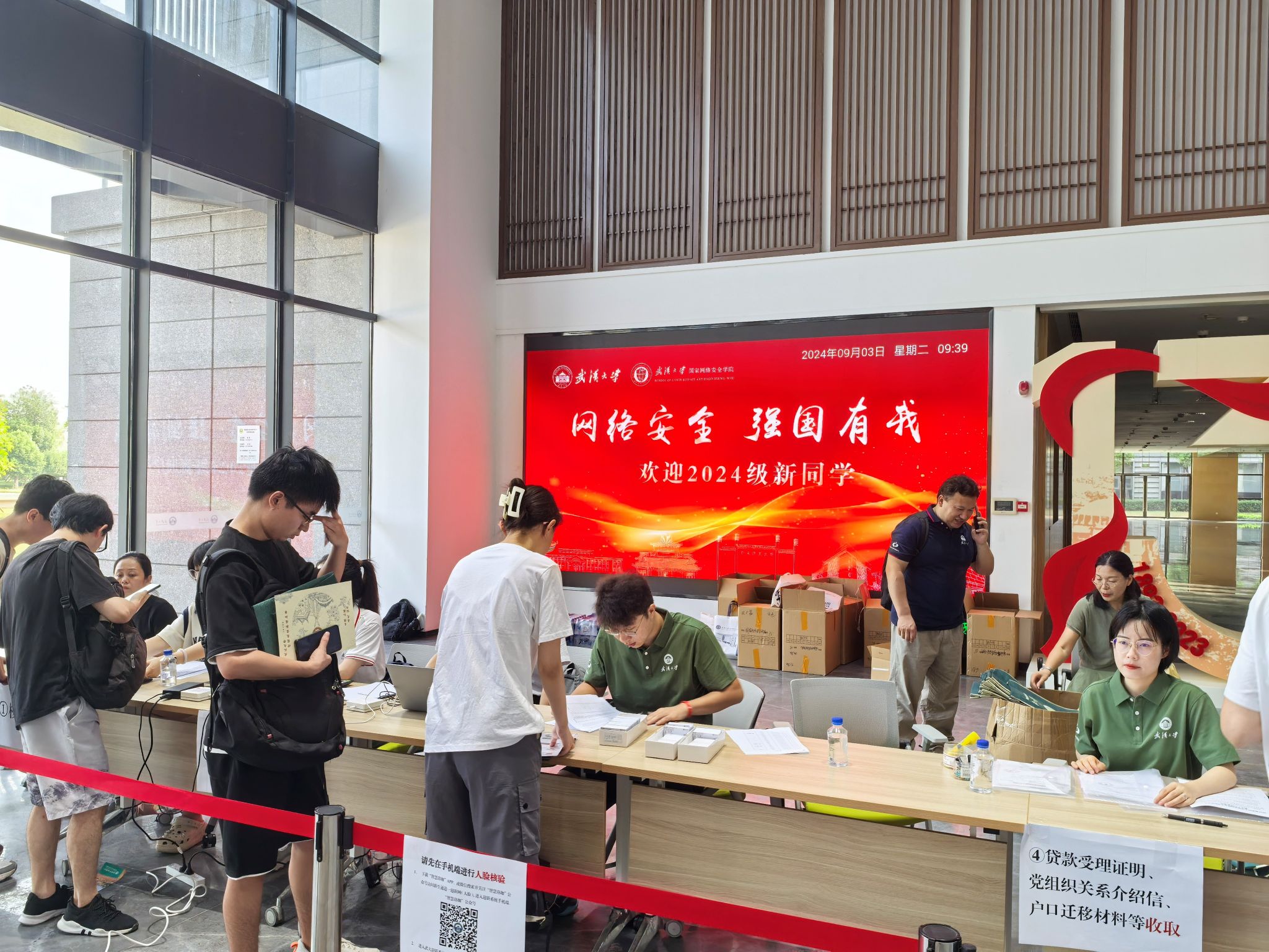 党委副书记瞿成雄,教学办刘丹、张昳宁老师,研究生辅导员余艳霞、刘路、石川老师,兼职辅导员余梦琦、彭一麟以及研究生会主席团成员张嘉蔚、胡宇义、修洋同学,已在网安基地新珈楼一楼大厅完成场地布置、设备调试及新生物资准备工作,迎接新同学的到来。
