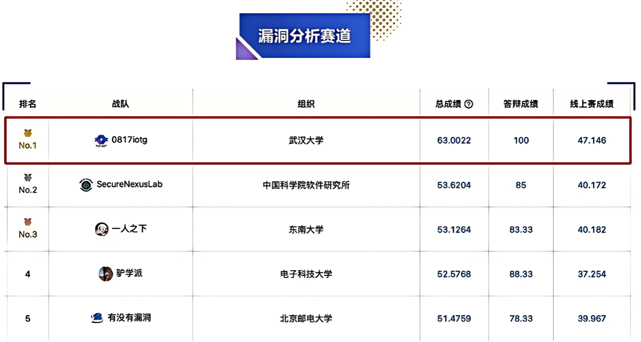 冠军 | 0817iotg | 漏洞分析 | 付泽智、吕锦钊、梅润元、姬玉龙、周国栋 | 彭国军 |