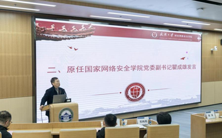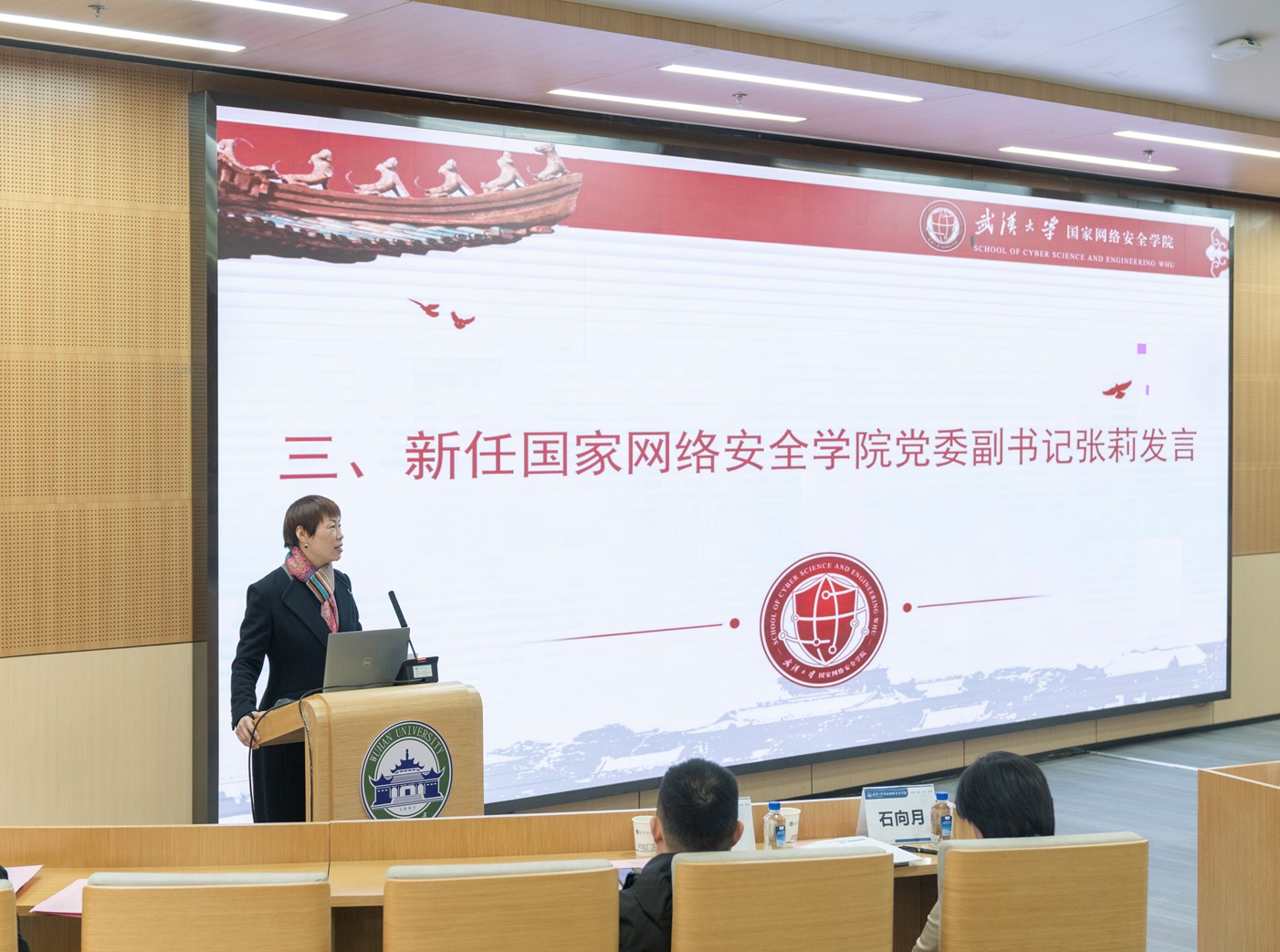 党委书记赵波代表学院对瞿成雄同志表示感谢,对张莉同志到网安学院工作表示祝贺。他提出三点希望,一是希望张莉同志进一步加强政治理论学习,深学细悟习近平新时代中国特色社会主义思想,特别是深入学习贯彻习近平总书记关于网络强国的重要思想。在工作中逐步了解和熟悉网络空间安全学科的特点特色、发展规律、发展现状和发展趋势,不断增强政治能力,坚持从学院建设大局出发,在原则与是非问题上敢于斗争和善于斗争;二是希望张莉同志加强谋划,真抓实干,努力为推进新一轮国家一流网络安全建设示范项目贡献力量,助力学院高水平网络安全拔尖创新人才培养取得新的成绩;三是要凝心聚力,共谋发展。学院上下要坚决支持张莉同志的工作,党政一心,认真贯彻执行民主集中制,坚决执行好两个议事规则,凝聚全体师生员工,共同推进学院各项工作的高质量发展。