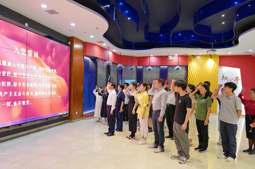 在党史展览馆的沉浸式学习中,讲解员带领大家再学党史、重温入党誓词、回顾党章的变迁、见证中国共产党在武汉留下的历史足迹,引领全体党员重走红色征程。通过诸多珍贵的历史图片、实物展示,以及虚拟仿真VR终端等互动设备,全体党员在这场融合科技与人文的党史教育中再次受到思想淬炼和精神洗礼。
