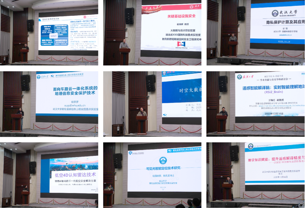 在科研汇报与交流研讨环节,各位老师的汇报聚焦国家战略需求,精准对接科研前沿。学院崔晓晖教授、艾浩军副教授、彭聪副教授分别以“关键基础设施安全”“遥感卫星安全防护技术”“隐私保护计算”为题做了汇报。测绘遥感信息工程全国重点实验室徐彦彦教授、呙维教授、万瑜廷副教授分别做了题为“面向车路云一体化系统的地理信息安全保护”“时空大数据分析与挖掘”“遥感智能解译脑(RSI2_Brain):实时智能理解地球”的精彩报告,龚江昆、杨先圣及崔浩老师也分别就地空4D雷达技术、可见光只能定位技术、提升遥感精度与可解释性等研究工作了主题汇报。