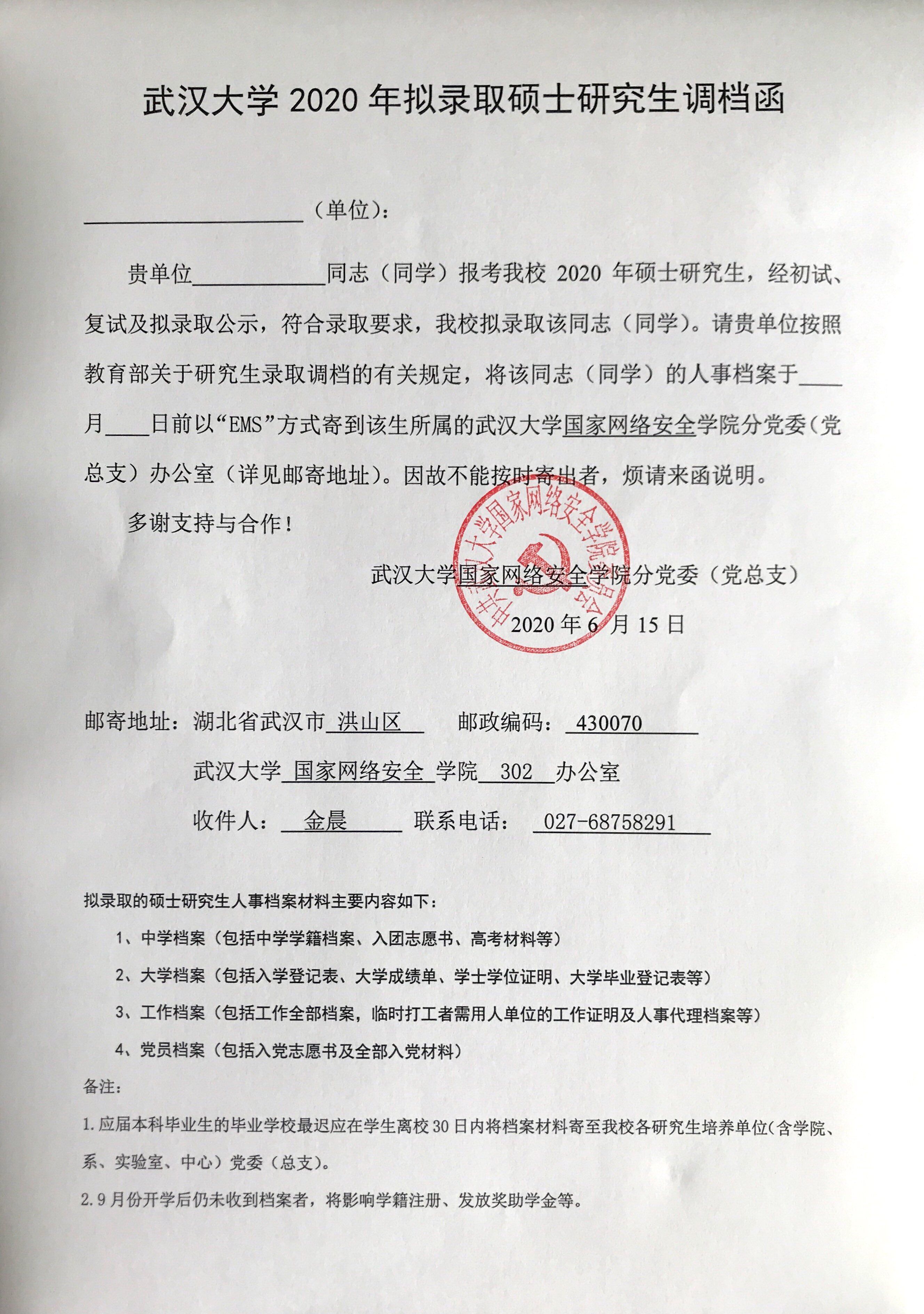 2020拟录取硕士研究生调档函》(以下简称:调档函,见附件),请同学们自行下载,加盖公章的页请彩打后填上自己的信息,然后一并交给本单位相关负责人(在校生请联系档案管理或辅导员老师)。